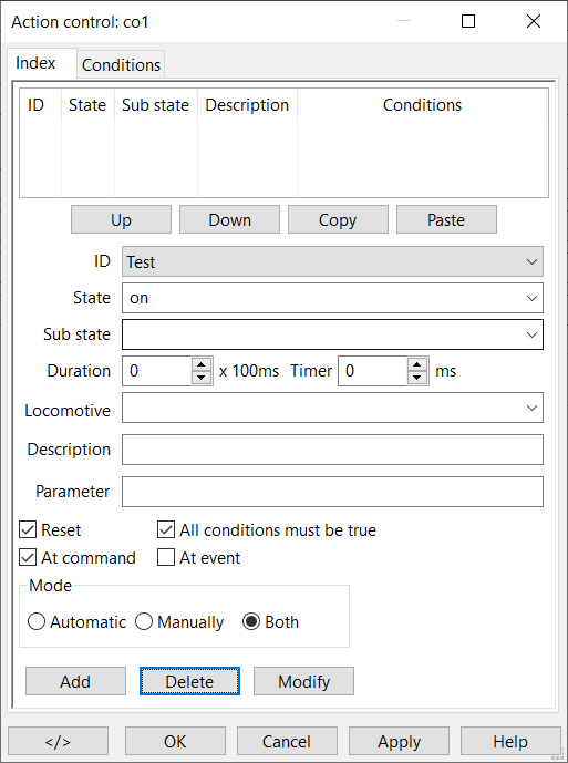 | Sistema | go-cmd, go-event, stop-cmd, stop-event, stoplocs, save, shutdown, analyse, reset, ebreak | Le azioni di sistema si trovano nel Menú Tabelle di Rocview |