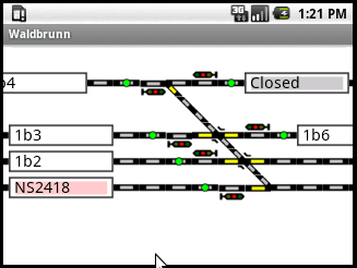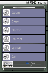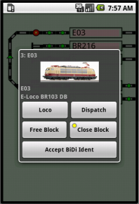 Anklicken der Lok öffnet die Lok-Liste. Auswahl einer Lok aus der Liste setzt die Lok in diesen Block.