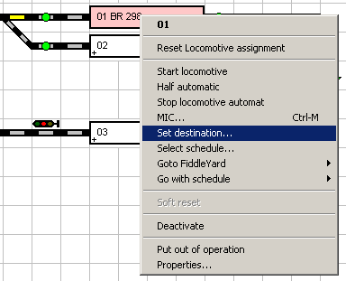 Une locomotive peut également être démarrée à partir du menu contextuel d'un bloc : Un clic droit est effectué sur le symbole du bloc où la locomotive attend actuellement et Définir destination… est sélectionné :