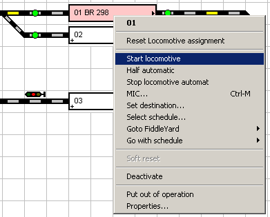 Dans la dernière étape, la locomotive doit être démarrée à partir du menu contextuel du bloc :