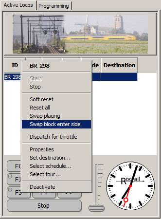Si la flèche de direction dans le bloc ne pointe pas dans la direction souhaitée, l'ID de locomotive sur le panneau de locomotive doit être cliqué avec le bouton droit de la souris et Changé le coté d'entrée du bloc doit être sélectionné dans le menu.