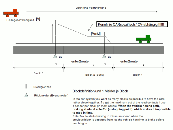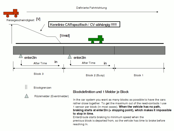 Für einen realistischen Autoverkehr werden so viele Blöcke wie möglich verwendet, um einen kurze Fahrzeugabfolge, also einen vergleichsweise dichten Verkehr zu simulieren. Daraus ergibt sich eine große Anzahl notwendiger Rückmelder, so dass sinnvollerweise und um die Kosten gering zu halten, möglichst nur ein Rückmelder pro Block verwendet wird. Hierzu gibt es mit enter2in und enter2route zwei Möglichkeiten: