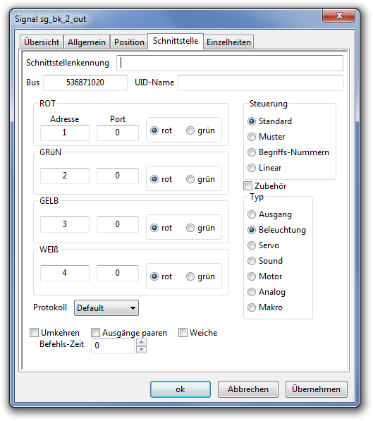| Ausgang | rot, grün | Nur für Weichen-Antriebe mit Einzel-Spule oder Ausgänge |