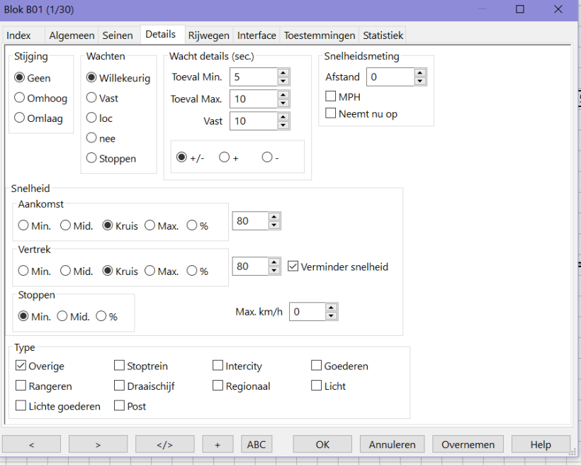 Of een loc reageert op deze instelling is afhankelijk van het blok type. Loc's van een niet ingestelde type zullen niet stoppen, maar zo mogelijk doorrijden.