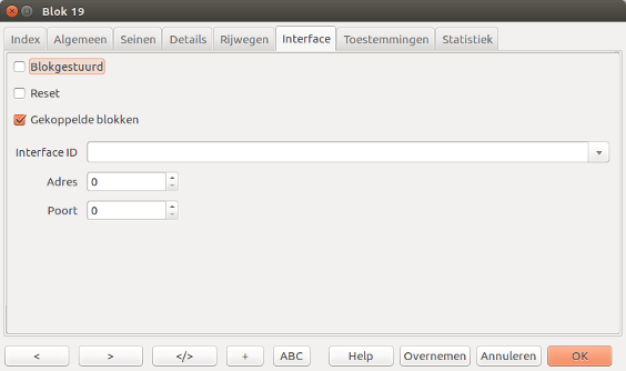Als een blok is verbonden aan een normale (DCC) loc decoder dient het DCC adres van deze decoder in het blok adres veld te zijn ingevuld. De poort kan 0 blijven.
