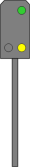 | Représentation schématique d'un signal lumineux de couleur allemand dans le système de signalisation H/V affichant Hp2, vitesse réduite |