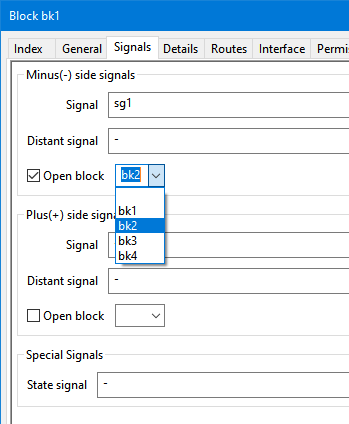 Dans l'exemple au dessus les blocs bk2, bk3 et bk4 sont convertis. Pour faire de bk2 un Bloc Ouvert, les propriétés du bloc du bloc précédant, bk1, sont ouverts (par exemple par un clic droit sur le symbole du bloc et en sélectionnant Propriétés… à partir du menu contextuel). Dans l'onglet Signaux la case à cocher Bloc Ouvert est activée. Ensuite, le "prochain bloc" approprié, bk2, est sélectionné à partir de la liste déroulante: