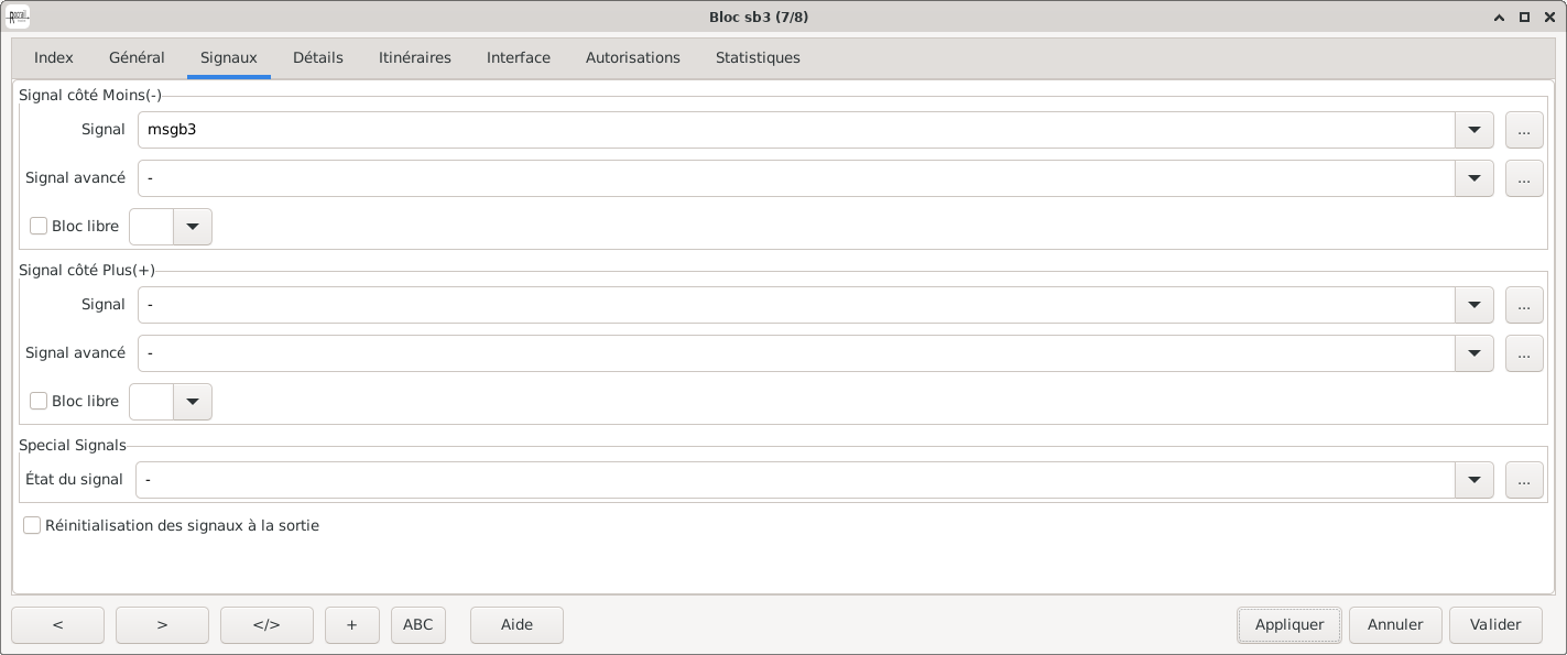 Tous les signaux existants qui sont liés au bloc sont sélectionnés dans les listes déroulantes pour chaque côté de bloc.