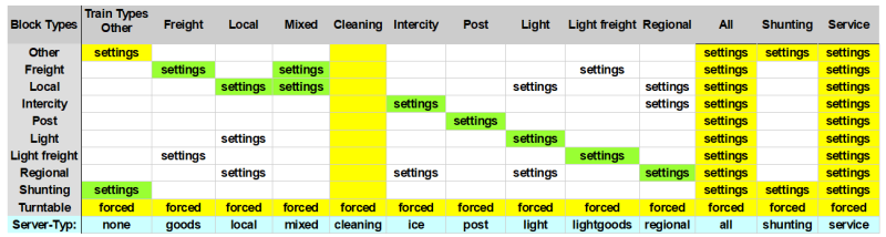 In addition to the train types mentioned below the type all obeys the wait settings in all kind of block. For trains of the types all and cleaning car all kinds of blocks are a preferred destination provided that the same train was not the last train entering this block.
