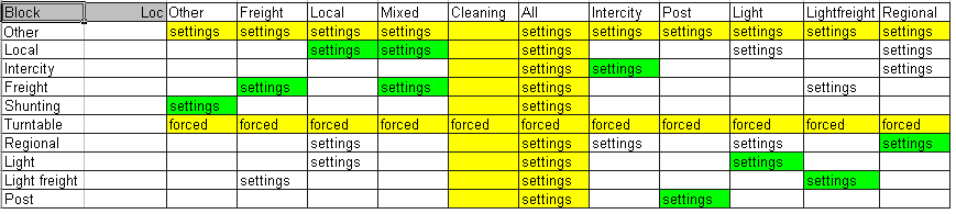 Naast de hieronder genoemde treintypes volgt het type all de wachtinstellingen in alle soorten blokken. Voor treinen van het type alle en schoonmaakauto zijn alle soorten blokken een voorkeursbestemming, op voorwaarde dat de dezelfde trein niet de laatste trein was die dit blok binnenreed.