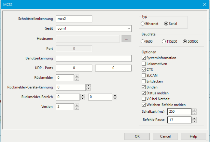 Märklin CS2/CS3-Zentrale als seriellen Typ einstellen.