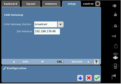 In section CAN the gateway has to be set to broadcast. The gateway address (broadcast address) is either set to the broadcast address of the particular network (see Network Settings below). Alternatively, if IP-addresses are set up manually it can be set to the IP-address of the computer on which the Rocrail server is running, .