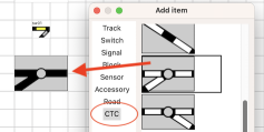 By editing the track plan CTC objects can be selected out of the "Add item" list and than can be dragged into the track plan.