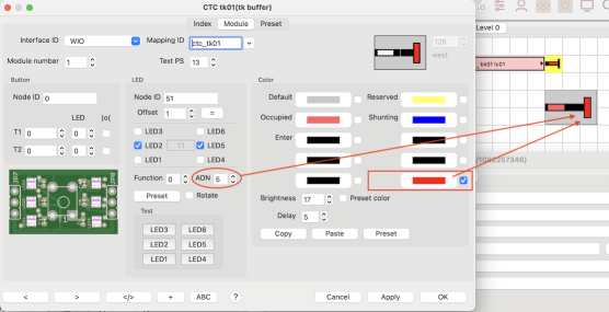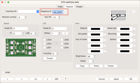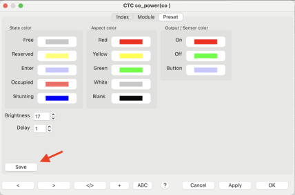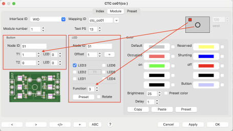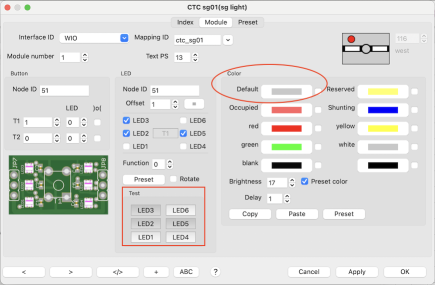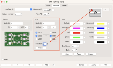 Configuring the LEDs in most cases is done by clicking the button "Preset". The checkboxes for the 6 LEDs fitting to the CTC object will be setup automatically. The LEDs will illuminate the track portion of the CTC module.