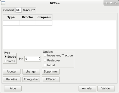 L'intervention manuel est requit, seulement dans le cas ou les autres options que celles par défaut doivent être utilisées au démarrage. Il est généralement recommandé de créer d'abord tous les objets sur le plan avec les broches désirées. Quand Rocrail doit être redémarré et que toutes les commandes des objets qui utilisent les broches de sortie doivent être exécuté une fois; parce que au démarrage toutes les broches des entrées utilisées et, lors de l'exécution d'une commande, toutes les broches de sortie sont crées à partir de Rocrail dans la centrale numérique DCC++ temporairement. Après cela, toutes les broches utilisées sont listées comme "Query" et les options peuvent être changées directement. A la fin n'oubliez pas de sauvegarder!