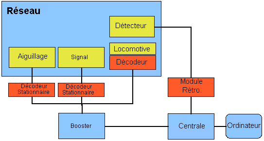 Chaque locomotive digitalisée possède un décodeur qui est à l'écoute des commandes avancer, stopper, changer de direction, ou enclancher des fonctions pour allumer des lumières, jouer un son, …