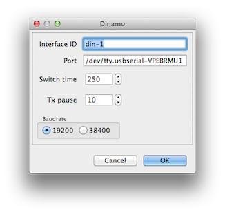 Standaard staat de baudrate op 19200. Via een dinamo-config applicatie, zie dinamo handleiding, laat dinamo zich ook instellen op 38400, optie " S1 38k4 ".