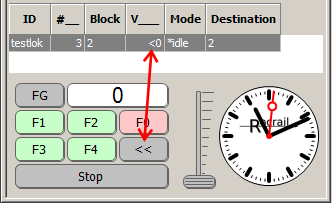 Note: 'Reverse' in this case refers to the running direction of the loco! The direction of movement nevertheless is forwards. The latter is indicated by the arrow head in the velocity column pointing to the right while the running direction of the loco is indicated by the negative sign:-0>.