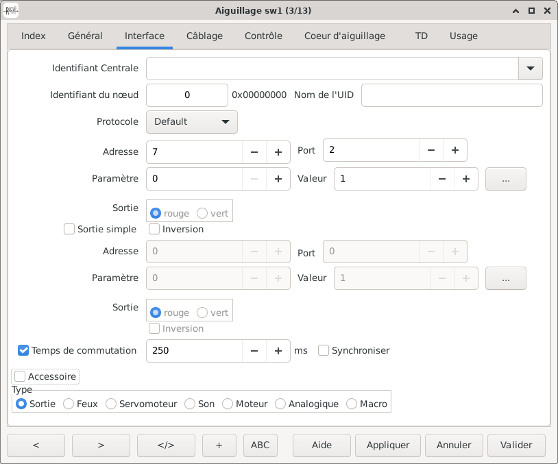 Pour un premier test un nouvel aiguillage est créé soit en utilisant l'éditeur du plan de voies soit à partir du menu Tables → Aiguillages. La liaison entre l'ECoS et l'aiguillage est réalisé par l'adresse de l'aiguillage. L'ECoS travaille avec un système d'adresse croissante (voir également Adressage) alors que dans Rocrail, un schéma d'adressage différent (MADA) est généralement utilisé: Adresse représente le numéro du décodeur et Port est le numéro de la sortie du décodeur. Sur un décodeur standard les ports de 1 à 4 sont disponibles. Le champ Adresse dans Rocrail ne se rapporte donc pas directement à l'adresse de l'ECoS! Cependant, l'ECoS montre également le schéma d'adressage MADA (adresse = 7 et port = 2 à titre d'exemple dans l'image ci-dessous).