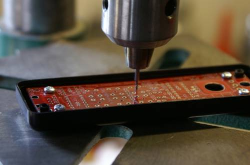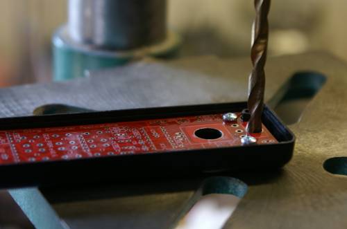 Zuerst wird die leere Platine im Gehäuse fixiert und für das Markieren/Vorbohren der exakten Positionen von Tastern, SW2 und LED's verwendet.