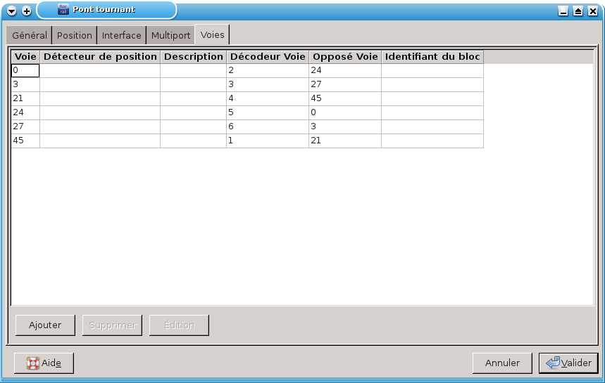 Dans l'onglet "Voies" le GCA145 range les positions physiques du pont tournant mappées sur les voies logiques de l'objet pont tournant du plan de voies.