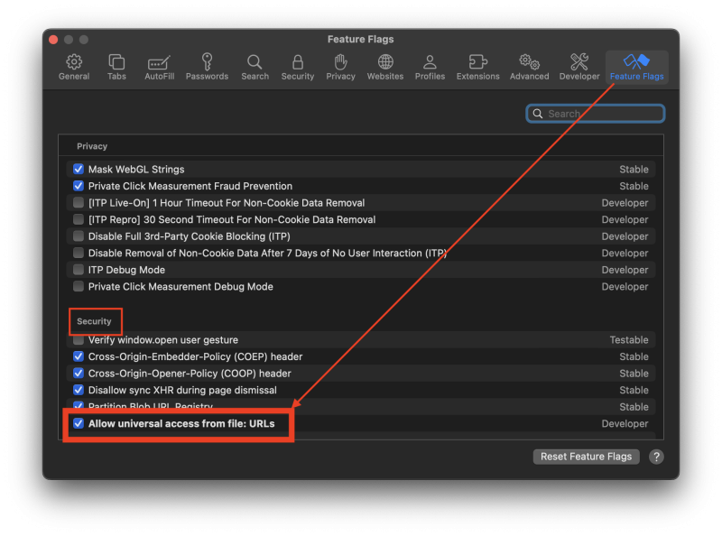 Safari n'autorise pas les URL de fichiers locaux par défaut.