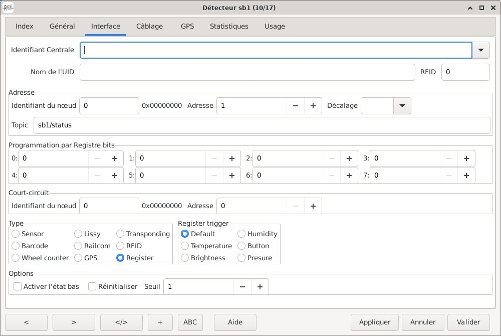 Les seconds champs Marche/Arrêt représentent la chaîne de commande pour Marche et Arrêt. (Les variables utilisateur sont supportées.)