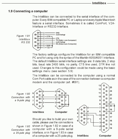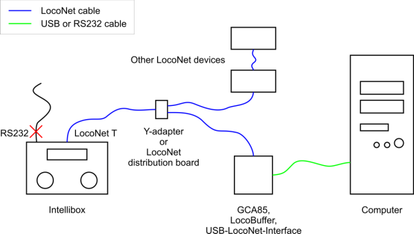 Par défaut l'Intellibox (IB) est connecté à l'ordinateur utilisant un câble RS232. Si l'ordinateur n'est pas équipé avec un port série un adaptateur USB-vers-série peut être utilisé. Voir également Assemblage de câbles à la fin de cette page.