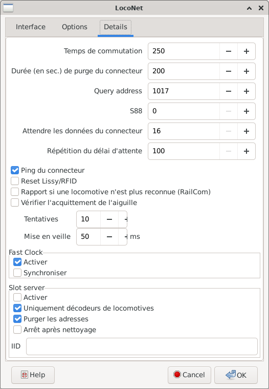 Dans l'onglet Détails la seule option pertinente est Durée de purge du connecteur: Les locomotives non utilisées seront purgées après un temps spécifié dans l'Intellibox. L'option Ping du connecteur peut être utilisée pour inhiber la purge. La valeur entrée dans le champ Durée de purge du connecteur devra être égale ou légèrement plus bas que le temps de purge de l'Intellibox.