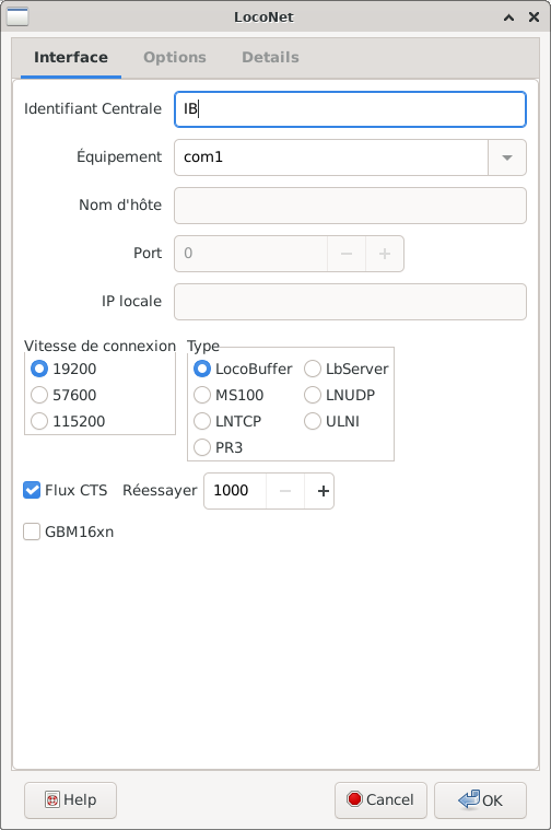 Note: Seulement l'interface (l'adaptateur) est configuré. L'IB devient une part du LocoNet et n'a donc pas besoin de configuration spéciale.