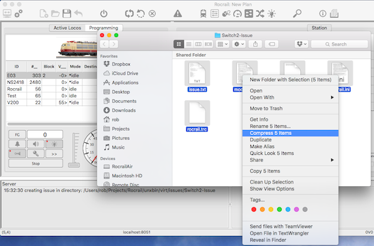 Si vous reportez un problème dans le Forum Rocrail vous devez fournir certains fichiers essentiels que vous pouvez facilement collecter avec cette fonction en quelques étapes: