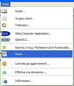 - Menu | Configurazione | Aggiornamento programma | Pannello locomotive | Scorciatoie da tastiera | Stato centrale digitale | Utilizzo di più client di visualizzazione | Rapporti | Connessione ad un server remoto | Cartelle di lavoro | Opzioni linea di comando | Rappresentare un problema