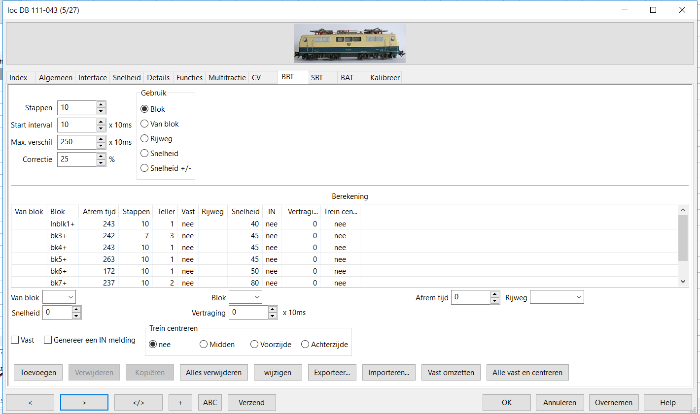 - Na het bewerken van de loc Trein zullen de eerdere BBT berekeningen mogelijk niet meer passen door de gewijzigde instellingen (bijv. lading). Er moet opnieuw geleerd worden.