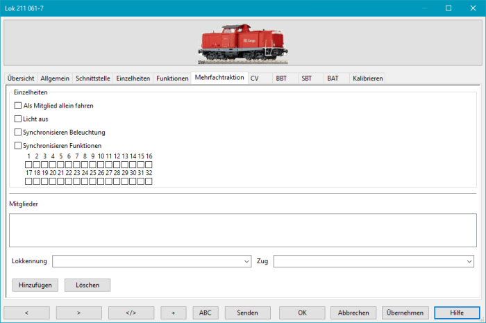 Über dieses Auswahlfeld können weitere Lokomotiven für diese Mehrfachtraktion ausgewählt und anschließend hinzugefügt bzw. gelöscht werden.