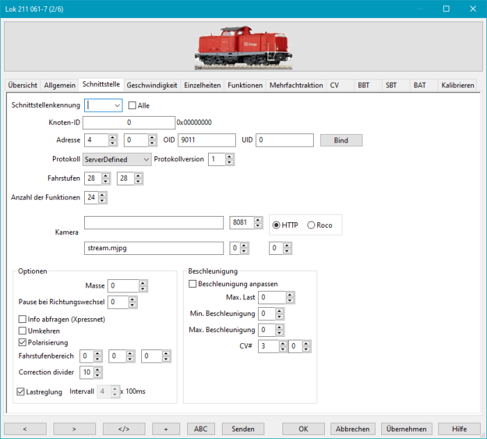 - Übersicht | Allgemein | Schnittstelle | Geschwindigkeit | Einzelheiten | Funktionen | Mehrfachtraktion | CV | BBT | SBT | BAT | Kalibrieren | Wartung | Rangiermodus
