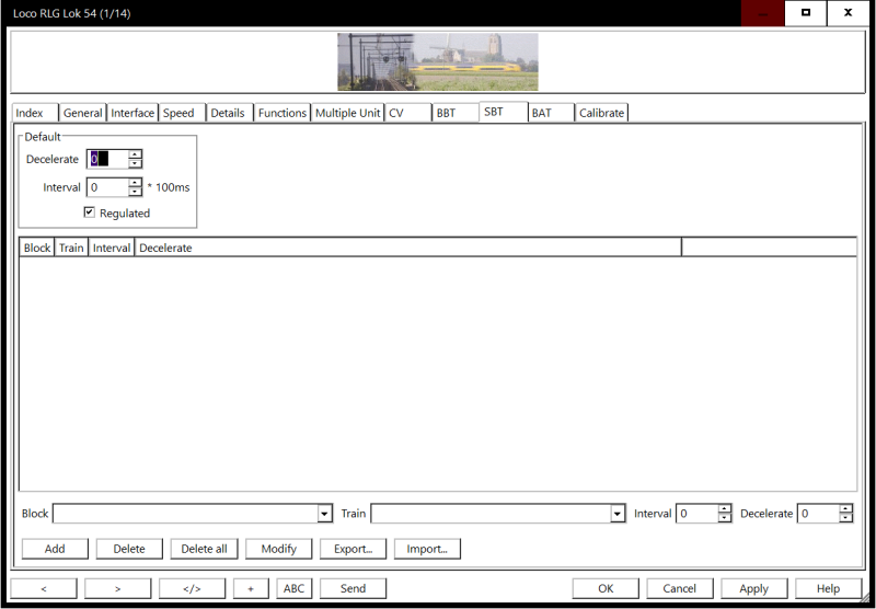 Astuce: l'Intervalle peut être utilisé pour augmenter la décélération / accélération pour les décodeurs avec une gamme de réglage limitée. Certaines anciennes locomotives Marklin avec un potentiomètre de contrôle souffrent de cette limitation. Une petite valeur d'Intervalle, e. g.dans cette gamme 1 à 5, peut aider dans ce cas. Il convient de noter qu'aucune autre locomotive nécessitant une pente de contrôle automatique de la vitesse (voir Régulation ci-dessous) est présent sur la disposition et que, dans tous les blocs, le type de ralentissement doit être réglé sur "aucun".