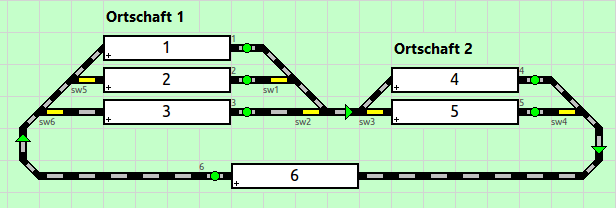 - Um den Ablauf zu ermöglichen und um ein Festfahren zu vermeiden, müssen sich alle Züge in dieser Ortschaft im Automatik-Modus befinden.
