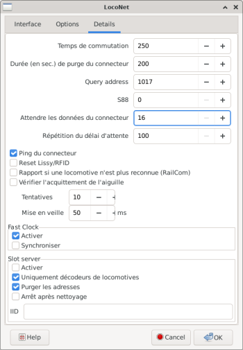 Certaines Centrales Numériques compatible LocoNet nécessite plus de temps pour être capable de répondre aux demandes du connecteur, et dans ce cas cette valeur devra être augmentée.