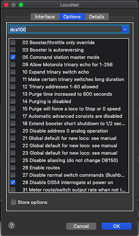 Een lijst van opties waaruit afhankelijk van het geselecteerde Command Station gekozen kan worden. Controleer uw handleiding voor een gedetailleerde verklaring van de opties. Veranderingen worden bevestigd door een vinkje te zetten in Store options en het scherm af te sluiten met OK.