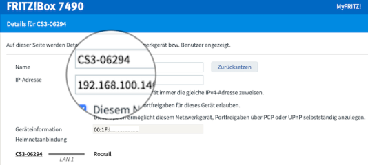 The host name, in this example CS3-06294, can be used in Rocrail instead of using the IP address,