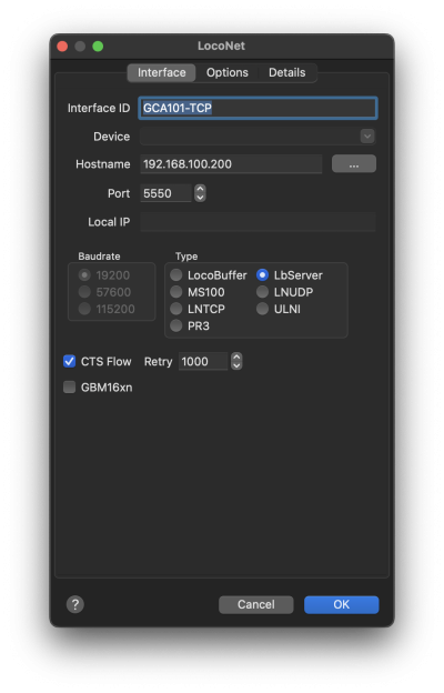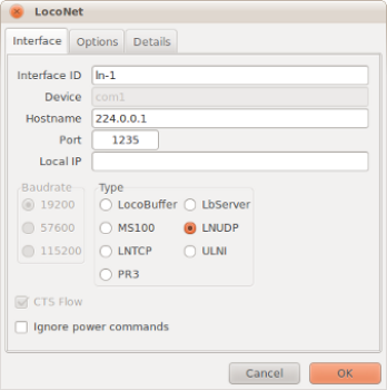 The communication between Rocrail and the GCA101 is by the User Datagram Protocol. Therefore, only the LNUDP LocoNet interface type is supported.