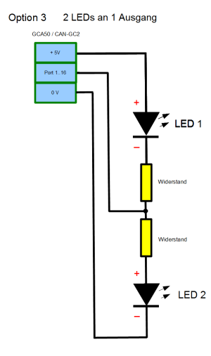 | 2 Möglichkeiten für den Anschluss einer LED | 2 LEDs an 1 Ausgang | 3 LEDs an 2 Ausgängen |