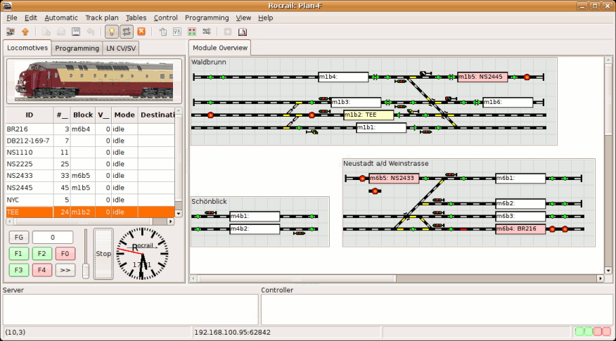 Iedere module/spoorplan heeft zijn eigen tab in Rocgui, en omdat je meerdere Rocgui's gekoppeld hebt met de server is het mogelijk om de gehele layout te tonen over een aantal computers.