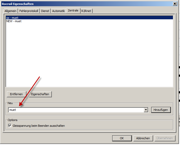 Wenn dort noch die virtuelle Zentrale vorhanden sein sollte, diese bitte löschen, indem die Zentrale markiert und anschließend der Button "Löschen" gedrückt wird. Danach aus dem Bereich NEU aus dem Drop-Down-Menü die Zeile mit dem Eintrag "muet" auswählen und den Button Hinzufügen drücken.