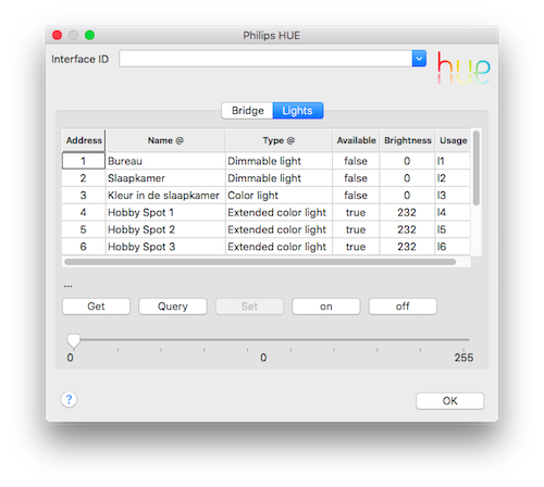This list can be helpful for checking which lights are known, and under which address, by the connected bridge.