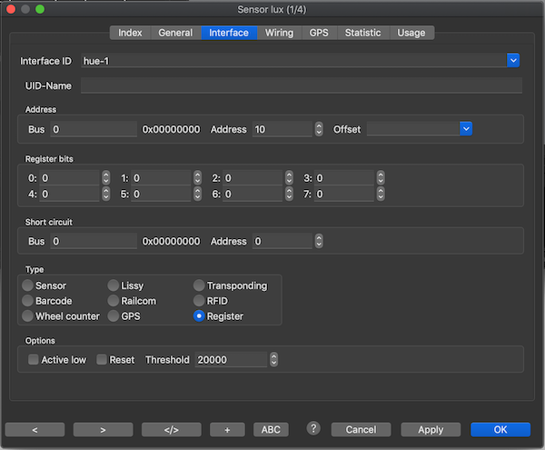 HUE sensors are numbered from 1 to 12, which are used as address in Rocrail.