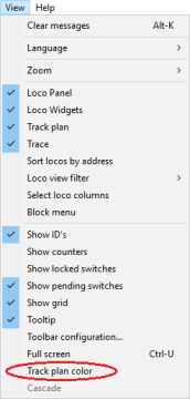 Si les couleurs ont été définies avec le menu contextuel plan de voies , la couleur définie avec le menu Affichage peut être écrasée lors du prochain redémarrage de Rocview par des couleurs individuelles pour les calques contenus dans le fichier "rocview.ini".