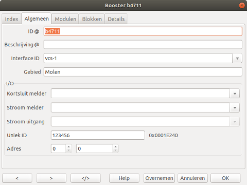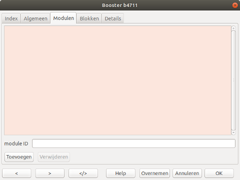 Voeg hier de naam of namen toe van de binnen rocrail gedefinieerde modules die door de betreffende booster worden gevoed.
