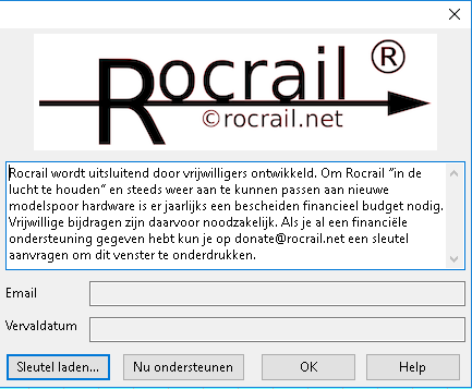 Als je dit scherm wilt onderdrukken bij het opstarten van Rocrail, ondersteun dan met minimaal 12 Euro .