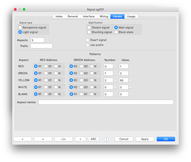 | Verzögereung(Dimmen) | Wird automatisch auf 10 gesetzt, so dass die LEDs langsam ein- und aus-gedimmt werden. Dieser Wert ist fest und kann in den Signaleigenschaften nicht geändert werden. |